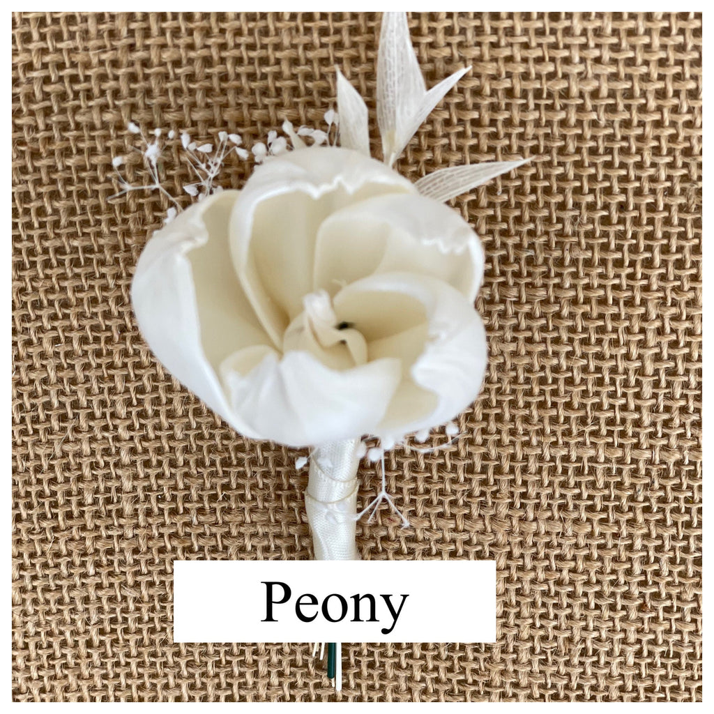 Choose your sola flower boutonniere. Boutonniere flowers are sola flowers in their raw, natural ivory state. Colors can also be chosen.