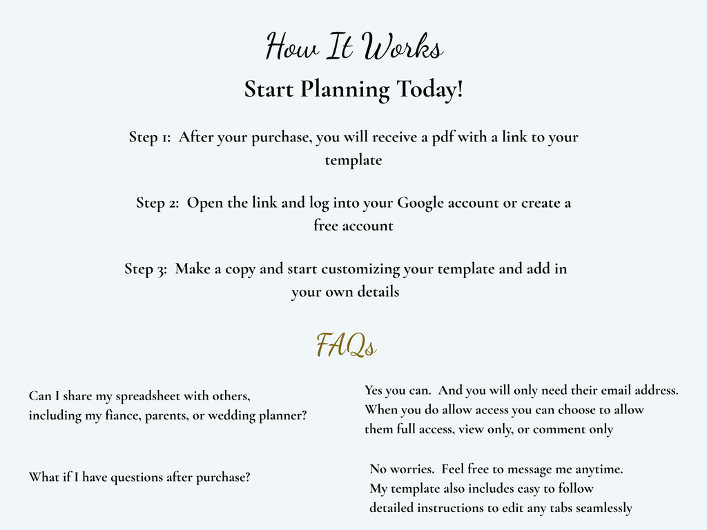 Get our Ultimate Bridal Glow Wedding Planning Bundle that includes this Google Sheets Wedding Planning Template and our digital CANVA template that covers all those extra creative details that will make your wedding day a success! Click HERE.